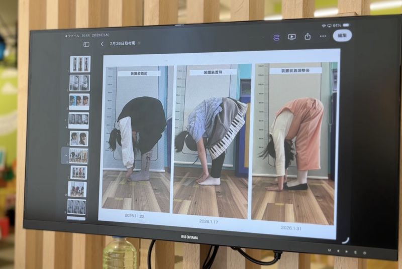 「あるお子さんに装置を入れ、舌がしっかりと前に出る状態を作ったところ、前屈の柔軟性が劇的に向上し、骨盤の角度も適切な位置に改善されました。柔軟体操をしたわけではなく、舌の位置が変わることで頚椎のカーブが整い、連動して全身の動きが変わったのです」